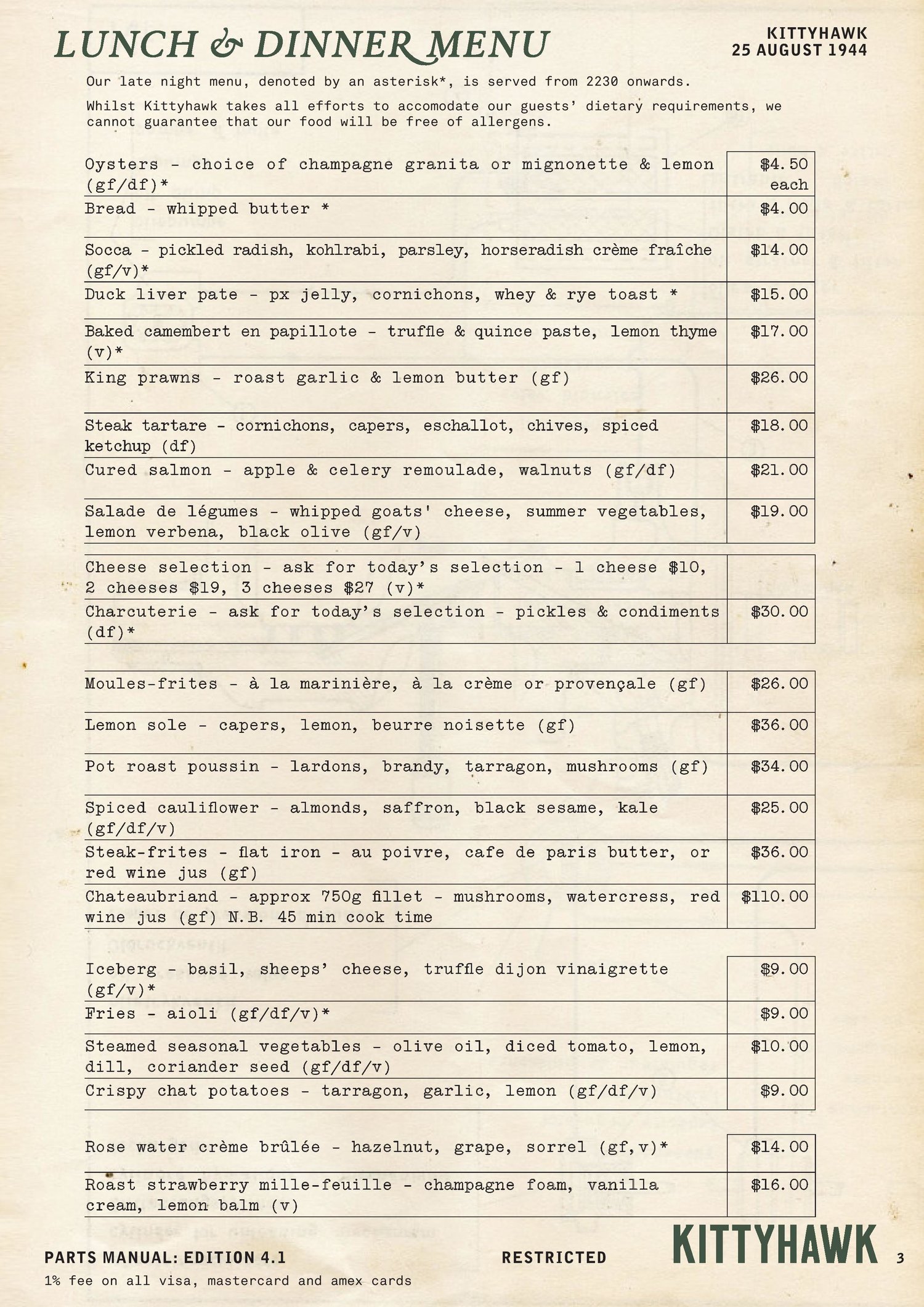 Kittyhawk is a high volume cocktail bar and restaurant in Sydney CBD focused on great cocktails and food and exceptional experiences. The venue is designed around the Liberation of Paris in 1944 and brings together an old world charm with a modern and delicious French restaurant menu. We helped to design the kitchen and ordered kitchen equipment for maximum efficiency. We designed an upscale bar and dinner menu that would be easy for a simple kitchen brigade to execute. We also helped recruit and train the head chef to run the kitchen and deliver the menu to the highest standards.